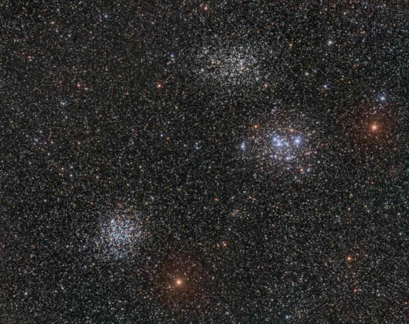 Galactic or open star clusters are young. The swarms of stars are born together near the plane of the Milky Way, but their numbers steadily dwindle as cluster members are ejected by galactic tides and gravitational interactions. Caught in this telescopic frame over three degrees across are three good examples of galactic star clusters, seen toward the southern sky's nautical constellation Puppis. Below and left, M46 is some 5,500 light-years in the distance. Right of center M47 is only 1,600 light-years away and NGC 2423 (top) is about 2500 light-years distant. Around 300 million years young M46 contains a few hundred stars in a region about 30 light-years across. Sharp eyes can spot a planetary nebula, NGC 2438, at about 11 o'clock against the M46 cluster stars. But that nebula's central star is billions of years old, and NGC 2438 is likely a foreground object only by chance along the line of sight to youthful M46. Even younger, aged around 80 million years, M47 is a smaller and looser star cluster spanning about 10 light-years. Star cluster NGC 2423 is pushing about 750 million years in age though. NGC 2423 is known to harbor an extrasolar planet, detected orbiting one of its red giant stars.