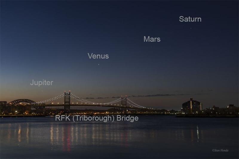 There's an interesting sky to see if you wake up before the Sun. Lined up on toward the eastern horizon are four planets in a row. The planets are so bright they can even be seen from the bright sky inside a city. In fact, the featured image was taken from New York City, USA, with the foreground highlighted by the RFK (Triborough) Bridge. Pictured, the planets are, left to right, Jupiter, Venus, Mars, and Saturn. The planets all appear in a row because they all orbit the Sun in the same plane. This plane, called the ecliptic plane, was created in the early days of our Solar System and includes all planets, including Earth. The morning planet parade will continue throughout April and May, and will even be joined by Mercury in June. APOD volunteer programming opportunity: Discord