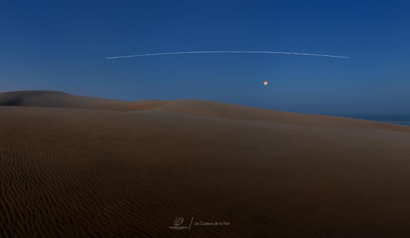 This serene sand and skyscape finds the Dune of Pilat on the coast of France still in Earth's shadow during the early morning hours of May 16. Extending into space, the planet's dark umbral shadow covered the Moon on that date. From that location the total phase of a lunar eclipse had begun before moonset. Still in sunlight though, the International Space Station crossed from the western horizon and Earth's largest artificial moon traced the bright flat arc through the sky over 400 km above. Simply constructed, the well-planned panoramic scene was captured over a 5 minutes in a series of consecutive images.