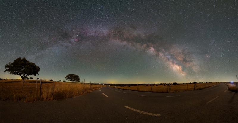 At night you can follow this road as it passes through the Dark Sky Alqueva reserve not too far from Alentejo, Portugal. Or you could stop, look up, and follow the Milky Way through the sky. Both stretch from horizon to horizon in this 180 degree panorama recorded on June 3. Our galaxy's name, the Milky Way, does refer to its appearance as a milky path in the sky. The word galaxy itself derives from the Greek for milk. From our fair planet the arc of the Milky Way is most easily visible on moonless nights from dark sky areas, though not quite so bright or colorful as in this image. The glowing celestial band is due to the collective light of myriad stars along the galactic plane too faint to be distinguished individually. The diffuse starlight is cut by dark swaths of the galaxy's obscuring interstellar dust clouds. Standing above the Milky Way arc near the top of this panoramic nightscape is bright star Vega, with the galaxy's central bulge near the horizon at the right.