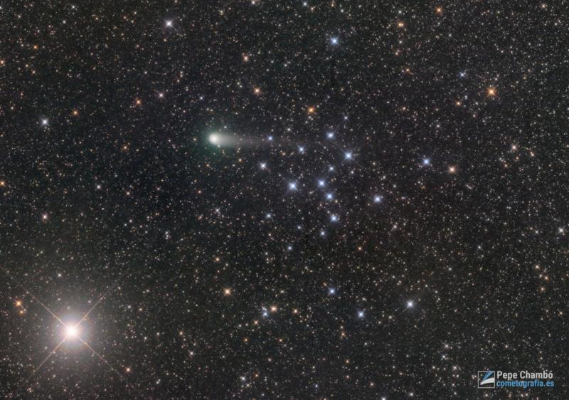 Imaged on June 20 2022, comet C/2017 K2 (PanSTARRS) shares this wide telescopic field of view with open star cluster IC 4665 and bright star Beta Ophiuchi, near a starry edge of the Milky Way. On its maiden voyage to the inner Solar System from the dim and distant Oort cloud, this comet PanSTARRS was initially spotted over five years ago, in May 2017. Then it was the most distant active inbound comet ever found, discovered when it was some 2.4 billion kilometers from the Sun. That put it between the orbital distances of Uranus and Saturn. Hubble Space Telescope observations indicated the comet had a large nucleus less than 18 kilometers in diameter. Now visible in small telescopes C/2017 K2 will make its closest approach to planet Earth on July 14 and closest approach to the Sun this December. Its extended coma and developing tail are seen here at a distance of some 290 million kilometers, a mere 16 light-minutes away.