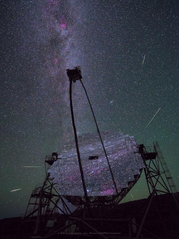 On August 11, 2021 a multi-mirror, 17 meter-diameter MAGIC telescope reflected this starry night sky from the Roque de los Muchachos European Northern Observatory on the Canary Island of La Palma. MAGIC stands for Major Atmospheric Gamma Imaging Cherenkov. The telescopes can see the brief flashes of optical light produced in particle air showers as high-energy gamma rays impact the Earth's upper atmosphere. To the dark-adapted eye the mirror segments offer a tantalizing reflection of stars and nebulae along the plane of our Milky Way galaxy. But directly behind the segmented mirror telescope, low on the horizon, lies the constellation Perseus. And on that date the dramatic composite nightscape also captured meteors streaming from the radiant of the annual Perseid meteor shower. This year the Perseid shower activity will again peak around August 13 but perseid meteors will have to compete with the bright light of a Full Moon.
