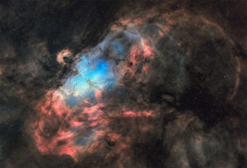 A star cluster around 2 million years young surrounded by natal clouds of dust and glowing gas, Messier 16 (M16) is also known as The Eagle Nebula. This beautifully detailed image of the region adopts the colorful Hubble palette and includes cosmic sculptures made famous in Hubble Space Telescope close-ups of the starforming complex. Described as elephant trunks or Pillars of Creation, dense, dusty columns rising near the center are light-years in length but are gravitationally contracting to form stars. Energetic radiation from the cluster stars erodes material near the tips, eventually exposing the embedded new stars. Extending from the ridge of bright emission left of center is another dusty starforming column known as the Fairy of Eagle Nebula. M16 lies about 7,000 light-years away, an easy target for binoculars or small telescopes in a nebula rich part of the sky toward the split constellation Serpens Cauda (the tail of the snake). As framed, this telescopic portrait of the Eagle Nebula is about 70 light-years across.
