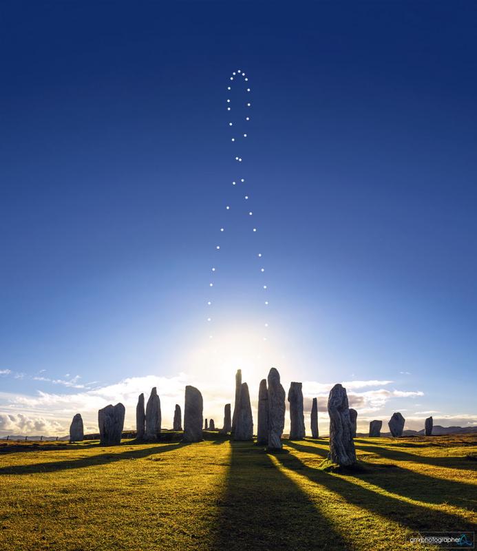 If you went outside at the same time every day and took a picture that included the Sun, how would the Sun's position change? A more visual answer to that question is an analemma, a composite image taken from the same spot at the same time over the course of a year. The featured analemma was composed from images taken every few days at noon near the village of Callanish in the Outer Hebrides in Scotland, UK. In the foreground are the Callanish Stones, a stone circle built around 2700 BC during humanity's Bronze Age. It is not known if the placement of the Callanish Stones has or had astronomical significance. The ultimate causes for the figure-8 shape of this and all analemmas are the tilt of the Earth axis and the ellipticity of the Earth's orbit around the Sun. At the solstices, the Sun will appear at the top or bottom of an analemma. The featured image was taken near the December solstice and so the Sun appears near the bottom. Equinoxes, however, correspond to analemma middle points -- not the intersection point. This coming Friday at 1:04 am (UT) -- Thursday in the Americas -- is the equinox ("equal night"), when day and night are equal over all of planet Earth. Many cultures celebrate a change of season at an equinox. Explore Your Universe: Random APOD Generator