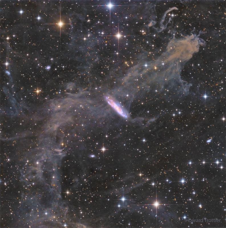 Do we dare believe our eyes? When we look at images of space, we often wonder whether they are "real", and just as often the best answer varies. In this case, the scene appears much as our eyes would see it, because it was obtained using RGB (Red, Green, Blue) filters like the cone cells in our eyes, except collecting light for 19 hours, not a fraction of a second. The featured image was captured over six nights, using a 24-inch diameter telescope in the Sierra Nevada Mountains, in California, USA. The bright spiral galaxy at the center (NGC 7497) looks like it is being grasped by an eerie tendril of a space ghost, and therein lies the trick. The galaxy is actually 59 million light years away, while the nebulosity is MBM 54, less than one thousand light years away, making it one of the nearest cool clouds of gas and dust -- galactic cirrus -- within our own Milky Way Galaxy. Both are in the constellation of Pegasus, which can be seen high overhead from northern latitudes in the autumn.