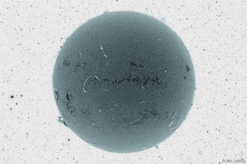 Does this strange dark ball look somehow familiar? If so, that might be because it is our Sun. In the featured image from 2012, a detailed solar view was captured originally in a very specific color of red light, then rendered in black and white, and then color inverted. Once complete, the resulting image was added to a starfield, then also color inverted. Visible in the image of the Sun are long light filaments, dark active regions, prominences peeking around the edge, and a moving carpet of hot gas. The surface of our Sun can be a busy place, in particular during Solar Maximum, the time when its surface magnetic field is wound up the most. Besides an active Sun being so picturesque, the plasma expelled can also become picturesque when it impacts the Earth's magnetosphere and creates auroras. Compute it Yourself: Browse 2,900+ codes in the Astrophysics Source Code Library