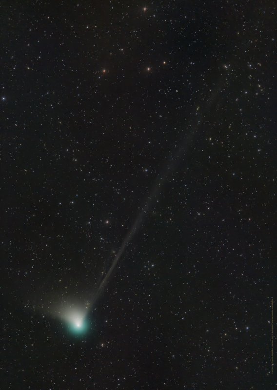 Comet C/2022 E3 (ZTF) was discovered by astronomers using the wide-field survey camera at the Zwicky Transient Facility this year in early March. Since then the new long-period comet has brightened substantially and is now sweeping across the northern constellation Corona Borealis in predawn skies. It's still too dim to see without a telescope though. But this fine telescopic image from December 19 does show the comet's brighter greenish coma, short broad dust tail, and long faint ion tail stretching across a 2.5 degree wide field-of-view. On a voyage through the inner Solar System comet 2022 E3 will be at perihelion, its closest to the Sun, in the new year on January 12 and at perigee, its closest to our fair planet, on February 1. The brightness of comets is notoriously unpredictable, but by then C/2022 E3 (ZTF) could become only just visible to the eye in dark night skies.