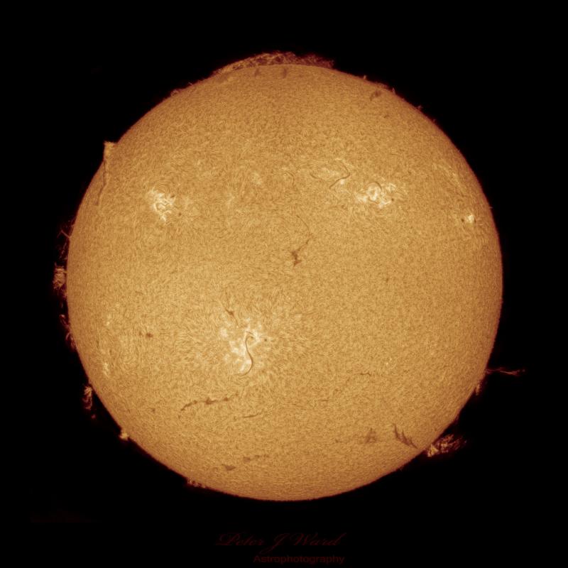 Perihelion for 2023, Earth's closest approach to the Sun, was on January 4 at 16:17 UTC. That was less than 24 hours after this sharp image of the Sun's disk was recorded with telescope and H-alpha filter from Sidney, Australia, planet Earth. An H-alpha filter transmits a characteristic red light from hydrogen atoms. In views of the Sun it emphasizes the Sun's chromosphere, a region just above the solar photosphere or normally visible solar surface. In this H-alpha image of the increasingly active Sun planet-sized sunspot regions are dominated by bright splotches called plages. Dark filaments of plasma snaking across the solar disk transition to bright prominences when seen above the solar limb.
