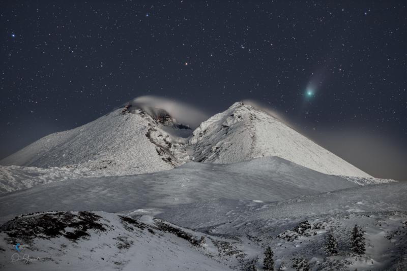Comet-like plumes are blowing over the volcanic peaks of Mount Etna in this wintry mountain-and-skyscape from planet Earth. The stacked and blended combination of individual exposures recorded during the cold night of January 23, also capture naked-eye Comet ZTF just above Etna's snowy slopes. Of course increasing sunlight and the solar wind are responsible for the comet's greenish coma and broad dusty tail. This weekend Comet ZTF is dashing across northern skies between north star Polaris and the Big Dipper. From a dark site you can only just spot it as a fuzzy patch though. That's still an impressive achievement if you consider you are gazing at a visitor from the distant Oort cloud with your own eyes. But binoculars or a small telescope will make for an even more enjoyable view of this Comet ZTF in the coming days. Comet ZTF Gallery: Notable Submissions to APOD