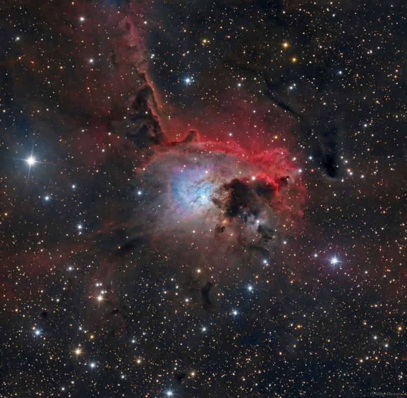 Centered in this colorful cosmic canvas, NGC 2626 is a beautiful, bright, blue reflection nebula in the southern Milky Way. Next to an obscuring dust cloud and surrounded by reddish hydrogen emission from large H II region RCW 27 it lies within a complex of dusty molecular clouds known as the Vela Molecular Ridge. NGC 2626 is itself a cloud of interstellar dust reflecting blue light from the young hot embedded star visible within the nebula. But astronomical explorations reveal many other young stars and associated nebulae in the star-forming region. NGC 2626 is about 3,200 light-years away. At that distance this telescopic field of view would span about 30 light-years along the Vela Molecular Ridge.