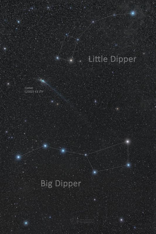 Can you still see the comet? Yes. Even as C/2022 E3 (ZTF) fades, there is still time to see it if you know where and when to look. Geometrically, Comet ZTF has passed its closest to both the Sun and the Earth and is now headed back to the outer Solar System. Its orbit around the Sun has it gliding across the northern sky all month, after passing near Polaris and both the Big and Little Dippers last month. Pictured, Comet ZTF was photographed between the two dippers in late January while sporting an ion tail that extended over 10 degrees. Now below naked-eye visibility, Comet ZTF can be found with binoculars or a small telescope and a good sky map. A good time to see the comet over the next week is after the Sun sets -- but before the Moon rises. The comet will move nearly in front of Mars in a few days Comet ZTF Gallery: Notable Submissions to APOD