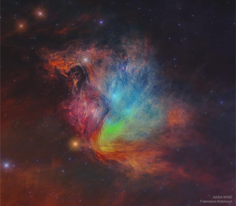 Is this really the famous Pleiades star cluster? Known for its iconic blue stars, the Pleiades is shown here in infrared light where the surrounding dust outshines the stars. Here three infrared colors have been mapped into visual colors (R=24, G=12, B=4.6 microns). The base images were taken by NASA's orbiting Wide Field Infrared Survey Explorer (WISE) spacecraft. Cataloged as M45 and nicknamed the Seven Sisters, the Pleiades star cluster is by chance situated in a passing dust cloud. The light and winds from the massive Pleiades stars preferentially repel smaller dust particles, causing the dust to become stratified into filaments, as seen. The featured image spans about 20 light years at the distance of the Pleiades, which lies about 450 light years distant toward the constellation of the Bull (Taurus).