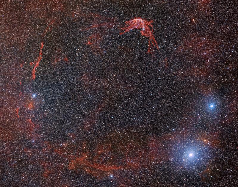 In 185 AD, Chinese astronomers recorded the appearance of a new star in the Nanmen asterism. That part of the sky is identified with Alpha and Beta Centauri on modern star charts. The new star was visible to the naked-eye for months, and is now thought to be the earliest recorded supernova. This deep telescopic view reveals the wispy outlines of emission nebula RCW 86, just visible against the starry background, understood to be the remnant of that stellar explosion. Captured by the wide-field Dark Energy Camera operating at Cerro Tololo Inter-American Observatory in Chile, the image traces the full extent of a ragged shell of gas ionized by the still expanding shock wave. Space-based images indicate an abundance of the element iron in RCW 86 and the absence of a neutron star or pulsar within the remnant, suggesting that the original supernova was Type Ia. Unlike the core collapse supernova explosion of a massive star, a Type Ia supernova is a thermonuclear detonation on a white dwarf star that accretes material from a companion in a binary star system. Near the plane of our Milky Way galaxy and larger than the full moon on the sky this supernova remnant is too faint to be seen by eye though. RCW 86 is some 8,000 light-years distant and around 100 light-years across.