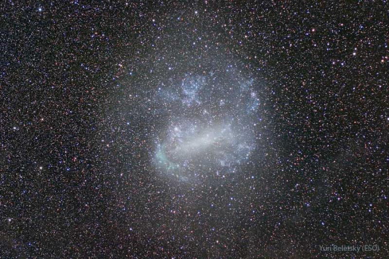 Is this a spiral galaxy? No. Actually, it is the Large Magellanic Cloud (LMC), the largest satellite galaxy of our own Milky Way Galaxy. The LMC is classified as a dwarf irregular galaxy because of its normally chaotic appearance. In this deep and wide exposure, however, the full extent of the LMC becomes visible. Surprisingly, during longer exposures, the LMC begins to resemble a barred spiral galaxy. The Large Magellanic Cloud lies only about 180,000 light-years distant towards the constellation of the Dolphinfish (Dorado). Spanning about 15,000 light-years, the LMC was the site of SN1987A, the brightest and closest supernova in modern times. Together with the Small Magellanic Cloud (SMC), the LMC can be seen in Earth's southern hemisphere with the unaided eye. Your Sky Surprise: What picture did APOD feature on your birthday? (post 1995)