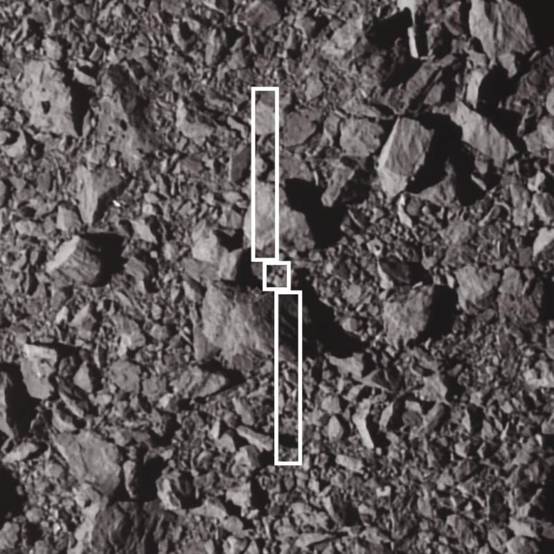On the first planetary defense test mission from planet Earth, the DART spacecraft captured this close-up on 26 September 2022, three seconds before slamming into the surface of asteroid moonlet Dimorphos. The spacecraft's outline with two long solar panels is traced at its projected point of impact between two boulders. The larger boulder is about 6.5 meters across. While the DART (Double Asteroid Redirection Test) spacecraft had a mass of some 570 kilograms, the estimated mass of Dimorphos, the smaller member of a near-Earth binary asteroid system, was about 5 billion kilograms. The direct kinetic impact of the spacecraft measurably altered the speed of Dimorphos by a fraction of a percent, reducing its 12 hour orbital period around its larger companion asteroid 65803 Didymos by about 33 minutes. Beyond successfully demonstrating a technique to change an asteroid's orbit that can prevent future asteroid strikes on planet Earth, the planetary-scale impact experiment has given the 150-meter-sized Dimorphos a comet-like tail of material.