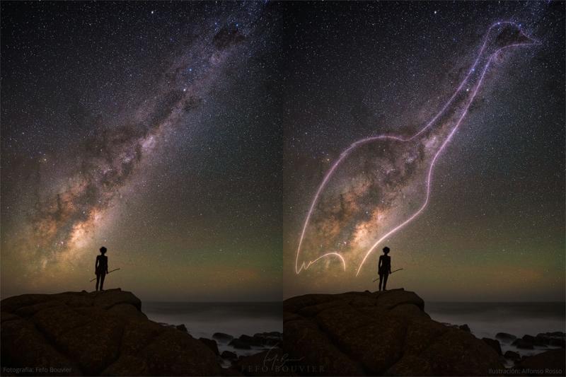 Have you seen the bird in the Milky Way? Beyond the man in the Moon, the night sky is filled with stories, and cultures throughout history have projected some of their most enduring legends onto the stars and dust above. Generations of people see these celestial icons, hear their associated stories, and pass them down. Pictured here is not only a segment of the central band of our Milky Way galaxy, but, according to folklore of several native peoples of Uruguay, the outline of a great bird called Ñandú. Furthermore, Ñandú's footprint is associated with the Southern Cross asterism. In the foreground, in silhouette, is a statue of María Micaela Guyunusa, an indigenous woman of the Charrúa people who lived in the 1800s and endures as a symbol of colonial resistance. The composite image was taken in mid-April in Cabo Polonio, Uruguay, with the Atlantic Ocean in the background.