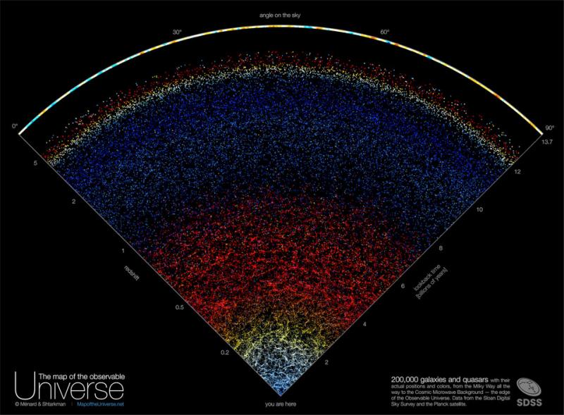 What if you could see out to the edge of the observable universe? You would see galaxies, galaxies, galaxies, and then, well, quasars, which are the bright centers of distant galaxies. To expand understanding of the very largest scales that humanity can see, a map of the galaxies and quasars found by the Sloan Digital Sky Survey from 2000 to 2020 -- out to near the edge of the observable universe -- has been composed. Featured here, one wedge from this survey encompasses about 200,000 galaxies and quasars out beyond a look-back time of 12 billion years and cosmological redshift 5. Almost every dot in the nearby lower part of the illustration represents a galaxy, with redness indicating increasing redshift and distance. Similarly, almost every dot on the upper part represents a distant quasar, with blue-shaded dots being closer than red. Clearly shown among many discoveries, gravity between galaxies has caused the nearby universe to condense and become increasingly more filamentary than the distant universe. More Detailed Maps: Related to Today's APOD