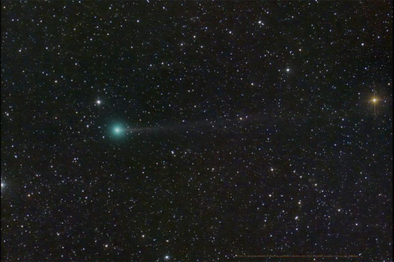 Will Comet Nishimura become visible to the unaided eye? Given the unpredictability of comets, no one can say for sure, but it currently seems like a good bet. The comet was discovered only ten days ago by Hideo Nishimura during 30-second exposures with a standard digital camera. Since then, C/2023 P1 Nishimura has increased in brightness and its path across the inner Solar System determined. As the comet dives toward the Sun, it will surely continue to intensify and possibly become a naked-eye object in early September. A problem is that the comet will also be angularly near the Sun, so it will only be possible to see it near sunset or sunrise. The comet will get so close to the Sun -- inside the orbit of planet Mercury -- that its nucleus may break up. Pictured, Comet Nishimura was imaged three days ago from June Lake, California, USA while sporting a green coma and a thin tail.