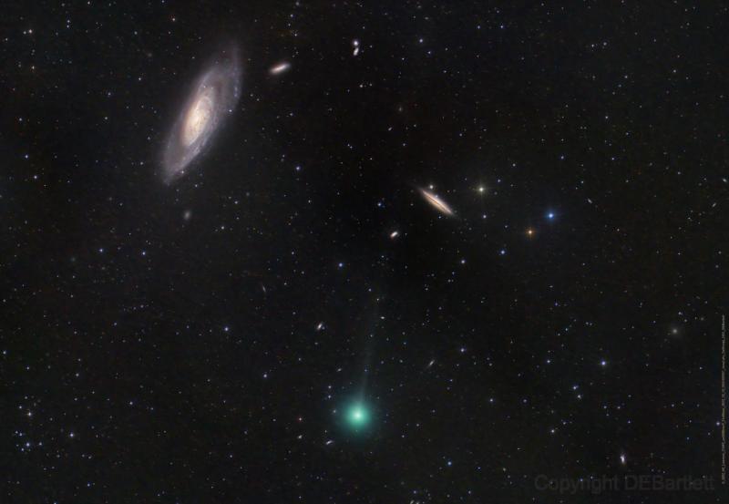 Galaxies abound in this sharp telescopic image recorded on October 12 in dark skies over June Lake, California. The celestial scene spans nearly 2 degrees within the boundaries of the well-trained northern constellation Canes Venatici. Prominent at the upper left 23.5 million light-years distant is big, beautiful spiral galaxy NGC 4258, known to some as Messier 106. Eye-catching edge-on spiral NGC 4217 is above and right of center about 60 million light-years away. Just passing through the pretty field of view is comet C/2023 H2 Lemmon, discovered last April in image data from the Mount Lemmon Survey. Here the comet sports more of a lime green coma though, along with a faint, narrow ion tail stretching toward the top of the frame. This visitor to the inner Solar System is presently less than 7 light-minutes away and still difficult to spot with binoculars, but it's growing brighter. Comet C/2023 H2 Lemmon will reach perihelion, its closest point to the Sun, on October 29 and perigee, its closest to our fair planet, on November 10 as it transitions from morning to evening northern skies.
