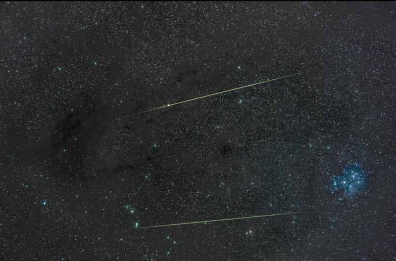 History's first known periodic comet, Comet Halley (1P/Halley), returns to the inner Solar System every 76 years or so. The famous comet made its last appearance to the naked-eye in 1986. But dusty debris from Comet Halley can be seen raining through planet Earth's skies twice a year during two annual meteor showers, the Eta Aquarids in May and the Orionids in October. In fact, an unhurried series of exposures captured these two bright meteors, vaporizing bits of Halley dust, during the early morning hours of October 23 against a starry background along the Taurus molecular cloud. Impacting the atmosphere at about 66 kilometers per second their greenish streaks point back to the shower's radiant just north of Orion's bright star Betelgeuse off the lower left side of the frame. The familiar Pleiades star cluster anchors the dusty celestial scene at the right.