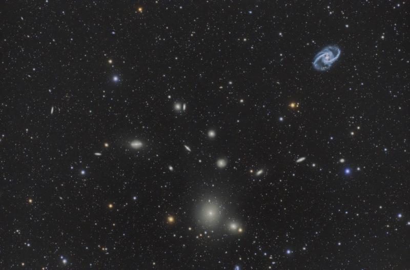 Named for the southern constellation toward which most of its galaxies can be found, the Fornax Cluster is one of the closest clusters of galaxies. About 62 million light-years away, it's over 20 times more distant than our neighboring Andromeda Galaxy, but only about 10 percent farther along than the better known and more populated Virgo Galaxy Cluster. Seen across this three degree wide field-of-view, almost every yellowish splotch on the image is an elliptical galaxy in the Fornax cluster. Elliptical galaxies NGC 1399 and NGC 1404 are the dominant, bright cluster members toward the bottom center. A standout, large barred spiral galaxy, NGC 1365, is visible on the upper right as a prominent Fornax cluster member.