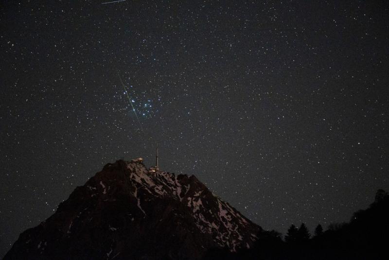 Near dawn on November 19 the Pleiades stood in still dark skies over the French Pyrenees. But just before sunrise a serendipitous moment was captured in this single 3 second exposure; a bright meteor streak appeared to pierce the heart of the galactic star cluster. From the camera's perspective, star cluster and meteor were poised directly above the mountain top observatory on the Pic du Midi de Bigorre. And though astronomers might consider the Pleiades to be relatively close by, the grain of dust vaporizing as it plowed through planet Earth's upper atmosphere actually missed the cluster's tight grouping of young stars by about 400 light-years. While recording a night sky timelapse series, the camera and telephoto lens were fixed to a tripod on the Tour-de-France-cycled slopes of the Col du Tourmalet about 5 kilometers from the Pic du Midi.