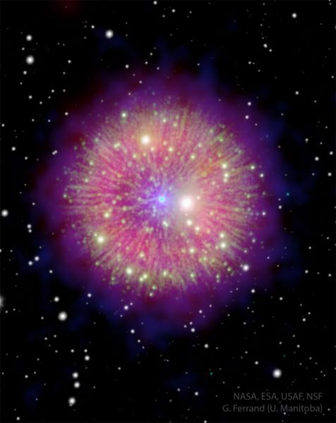 What created this unusual celestial firework? The nebula, dubbed Pa 30, appears in the same sky direction now as a bright "guest star" did in the year 1181. Although Pa 30's filaments look similar to that created by a nova (for example GK Per), and a planetary nebula (for example NGC 6751), some astronomers now propose that it was created by a rare type of supernova: a thermonuclear Type Iax, and so is (also) named SN 1181. In this model, the supernova was not the result of the detonation of a single star, but rather a blast that occurred when two white dwarf stars spiraled together and merged. The blue dot in the center is hypothesized to be a zombie star, the remnant white dwarf that somehow survived this supernova-level explosion. The featured image combines images and data obtained with infrared (WISE), visible (MDM, Pan-STARRS), and X-ray (Chandra, XMM) telescopes. Future observations and analyses may tell us more. NASA Coverage: Total Solar Eclipse of 2024 April 8