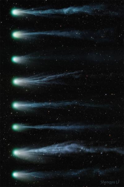 How does a comet tail change? It depends on the comet. The ion tail of Comet 12P/Pons–Brooks has been changing markedly, as detailed in the featured image sequenced over nine days from March 6 to 14 (top to bottom). On some days, the comet's ion tail was relatively long and complex, but not every day. Reasons for tail changes include the rate of ejection of material from the comet's nucleus, the strength and complexity of the passing solar wind, and the rotation rate of the comet. Over the course of a week, apparent changes even include a change of perspective from the Earth. In general, a comet's ion tail will point away from the Sun, as gas expelled is pushed out by the Sun's wind. Today, Pons-Brooks may become a rare comet suddenly visible in the middle of the day for those able to see the Sun totally eclipsed by the Moon. NASA Coverage: Today's Total Solar Eclipse Total Eclipse Imagery: Notable Submissions to APOD
