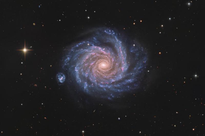 From our vantage point in the Milky Way Galaxy, we see NGC 1232 face-on. Nearly 200,000 light-years across, the big, beautiful spiral galaxy is located some 47 million light-years away in the flowing southern constellation of Eridanus. This sharp, multi-color, telescopic image of NGC 1232 includes remarkable details of the distant island universe. From the core outward, the galaxy's colors change from the yellowish light of old stars in the center to young blue star clusters and reddish star forming regions along the grand, sweeping spiral arms. NGC 1232's apparent, small, barred-spiral companion galaxy is cataloged as NGC 1232A. Distance estimates place it much farther though, around 300 million light-years away, and unlikely to be interacting with NGC 1232. Of course, the prominent bright star with the spiky appearance is much closer than NGC 1232 and lies well within our own Milky Way.