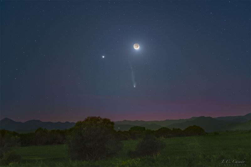 Three bright objects satisfied seasoned stargazers of the western sky just after sunset earlier this month. The most familiar was the Moon, seen on the upper left in a crescent phase. The rest of the Moon was faintly visible by sunlight first reflected by the Earth. The bright planet Jupiter, the largest planet in the Solar System, is seen to the upper left. Most unusual was Comet 12P/Pons-Brooks, below the Moon and showing a stubby dust tail on the right but an impressive ion tail extending upwards. The featured image, a composite of several images taken consecutively at the same location and with the same camera, was taken near the village of Llers, in Spain's Girona province. Comet Pons-Brooks passed its closest to the Sun last week and is now dimming as it moves into southern skies and returns to the outer Solar System. Almost Hyperspace: Random APOD Generator
