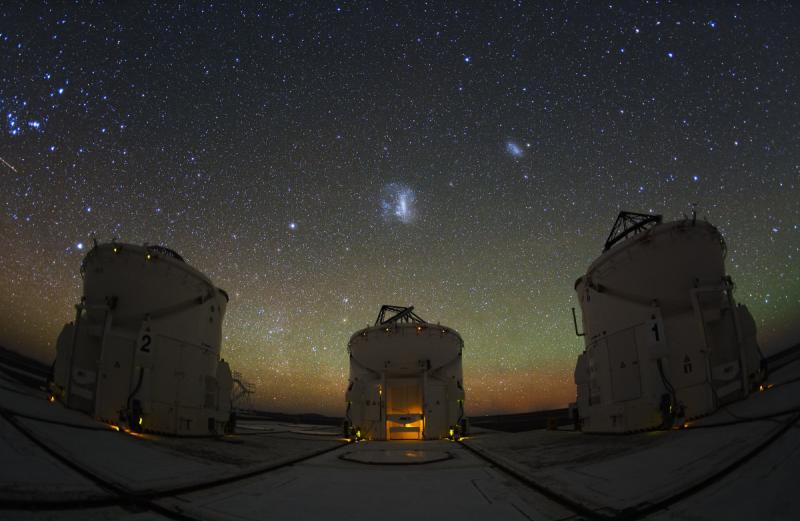 Despite their resemblance to R2D2, these three are not the droids you're looking for. Instead, the enclosures house 1.8 meter Auxiliary Telescopes (ATs) at Paranal Observatory in the Atacama Desert region of Chile. The ATs are designed to be used for interferometry, a technique for achieving extremely high resolution observations, in concert with the observatory's 8 meter Very Large Telescope units. A total of four ATs are operational, each fitted with a transporter that moves the telescope along a track allowing different arrays with the large unit telescopes. To work as an interferometer, the light from each telescope is brought to a common focal point by a system of mirrors in underground tunnels. Above these three ATs, the Large and Small Magellanic Clouds are the far, far away satellite galaxies of our own Milky Way. In the clear and otherwise dark southern skies, planet Earth's greenish atmospheric airglow stretches faintly along the horizon.