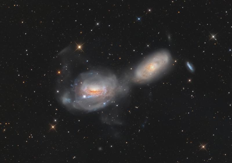 Spiral galaxy NGC 3169 looks to be unraveling like a ball of cosmic yarn. It lies some 70 million light-years away, south of bright star Regulus toward the faint constellation Sextans. Wound up spiral arms are pulled out into sweeping tidal tails as NGC 3169 (left) and neighboring NGC 3166 interact gravitationally. Eventually the galaxies will merge into one, a common fate even for bright galaxies in the local universe. Drawn out stellar arcs and plumes are clear indications of the ongoing gravitational interactions across the deep and colorful galaxy group photo. The telescopic frame spans about 20 arc minutes or about 400,000 light-years at the group's estimated distance, and includes smaller, bluish NGC 3165 to the right. NGC 3169 is also known to shine across the spectrum from radio to X-rays, harboring an active galactic nucleus that is the site of a supermassive black hole.