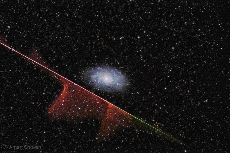 The galaxy was never in danger. For one thing, the Triangulum galaxy (M33), pictured, is much bigger than the tiny grain of rock at the head of the meteor. For another, the galaxy is much farther away -- in this instance 3 million light years as opposed to only about 0.0003 light seconds. Even so, the meteor's path took it angularly below the galaxy. Also the wind high in Earth's atmosphere blew the meteor's glowing evaporative molecule train away from the galaxy, in angular projection. Still, the astrophotographer was quite lucky to capture both a meteor and a galaxy in a single exposure -- which was subsequently added to two other images of M33 to bring up the spiral galaxy's colors. At the end, the meteor was gone in a second, but the galaxy will last billions of years. Your Sky Surprise: What picture did APOD feature on your birthday? (post 1995)