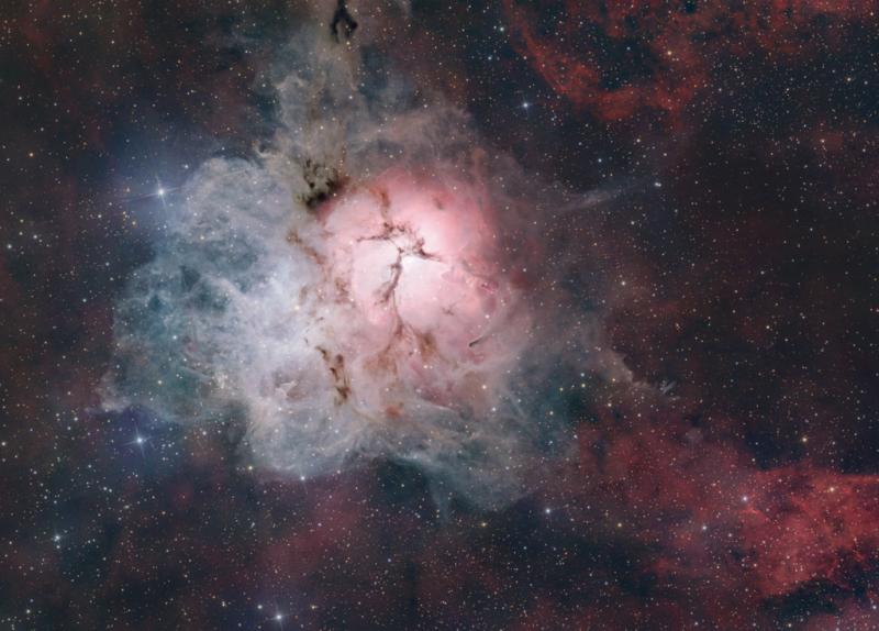 Messier 20, popularly known as the Trifid Nebula, lies about 5,000 light-years away toward the nebula rich constellation Sagittarius. A star forming region in the plane of our galaxy, the Trifid does illustrate three different types of astronomical nebulae; red emission nebulae dominated by light from hydrogen atoms, blue reflection nebulae produced by dust reflecting starlight, and dark nebulae where dense dust clouds appear in silhouette. The reddish emission region, roughly separated into three parts by obscuring dust lanes, is what lends the Trifid its popular name. The cosmic cloud complex is over 40 light-years across and would cover the area of a full moon on planet Earth's sky. But the Trifid Nebula is too faint to be seen by the unaided eye. Over 75 hours of image data captured under dark night skies was used to create this stunning telescopic view. Watch: The Perseid Meteor Shower