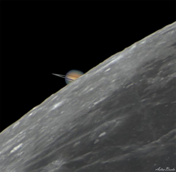 What if Saturn disappeared? Sometimes, it does. It doesn't really go away, though, it just disappears from view when our Moon moves in front. Such a Saturnian eclipse, more formally called an occultation, was visible along a long swath of Earth -- from Peru, across the Atlantic Ocean, to Italy -- only a few days ago. The featured color image is a digital fusion of the clearest images captured during the event and rebalanced for color and relative brightness between the relatively dim Saturn and the comparatively bright Moon. Saturn and the comparative bright Moon. The exposures were all taken from Breda, Catalonia, Spain, just before occultation. Eclipses of Saturn by our Moon will occur each month for the rest of this year. Each time, though, the fleeting event will be visible only to those with clear skies -- and the right location on Earth. Gallery: Moon Eclipses Saturn in August 2024