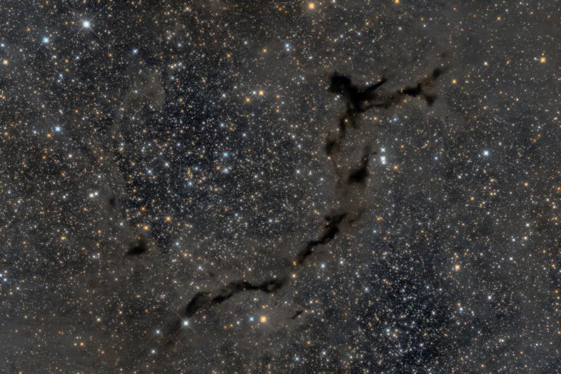 Spanning light-years, this suggestive shape known as the Seahorse Nebula floats in silhouette against a rich, luminous background of stars. Seen toward the royal northern constellation of Cepheus, the dusty, dark nebula is part of a Milky Way molecular cloud some 1,200 light-years distant. It is also listed as Barnard 150 (B150), one of 182 dark markings of the sky cataloged in the early 20th century by astronomer E. E. Barnard. Packs of low mass stars are forming within, but their collapsing cores are only visible at long infrared wavelengths. Still, the colorful Milky Way stars of Cepheus add to this stunning galactic skyscape. Growing Gallery: This week's supermoon eclipse
