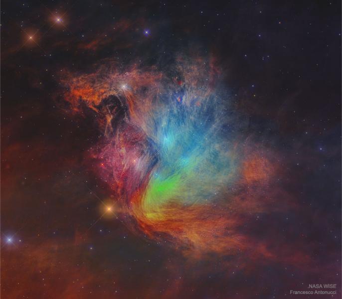 Is this really the famous Pleiades star cluster? Known for its iconic blue stars, the Pleiades is shown here in infrared light where the surrounding dust outshines the stars. Here, three infrared colors have been mapped into visual colors (R=24, G=12, B=4.6 microns). The base images were taken by NASA's orbiting Wide Field Infrared Survey Explorer (WISE) spacecraft. Cataloged as M45 and nicknamed the Seven Sisters, the Pleiades star cluster is by chance situated in a passing dust cloud. The light and winds from the massive Pleiades stars preferentially repel smaller dust particles, causing the dust to become stratified into filaments, as seen. The featured image spans about 20 light years at the distance of the Pleiades, which lies about 450 light years distant toward the constellation of the Bull (Taurus).