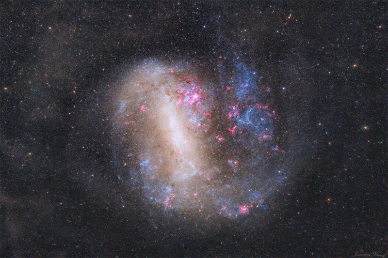 It is the largest satellite galaxy of our home Milky Way Galaxy. If you live in the south, the Large Magellanic Cloud (LMC) is quite noticeable, spanning about 10 degrees across the night sky, which is 20 times larger than the full moon towards the southern constellation of the dolphinfish (Dorado). Being only about 160,000 light years away, many details of the LMC's structure can be seen, such as its central bar and its single spiral arm. The LMC harbors numerous stellar nurseries where new stars are being born, which appear in pink in the featured image. It is home to the Tarantula Nebula, the currently most active star forming region in the entire Local Group, a small collection of nearby galaxies dominated by the massive Andromeda and Milky Way galaxies. Studies of the LMC and the Small Magellanic Cloud (SMC) by Henrietta Swan Leavitt led to the discovery of the period-luminosity relationship of Cepheid variable stars that are used to measure distances across the nearby universe. Survey: Color Blindness and Astronomical Images