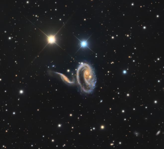 The colorful, spiky stars are in the foreground of this image taken with a small telescope on planet Earth. They lie well within our own Milky Way Galaxy. But the two eye-catching galaxies in the frame lie far beyond the Milky Way, at a distance of over 300 million light-years. The galaxies' twisted and distorted appearance is due to mutual gravitational tides as the pair engage in close encounters. Cataloged as Arp 273 (also as UGC 1810), these galaxies do look peculiar, but interacting galaxies are now understood to be common in the universe. Closer to home, the large spiral Andromeda Galaxy is known to be some 2 million light-years away and inexorably approaching the Milky Way. In fact the far away peculiar galaxies of Arp 273 may offer an analog of the far future encounter of Andromeda and Milky Way. Repeated galaxy encounters on a cosmic timescale ultimately result in a merger into a single galaxy of stars. From our perspective, the bright cores of the Arp 273 galaxies are separated by only a little over 100,000 light-years.