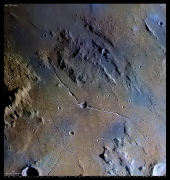 Rima Hyginus is a spectacular fissure, some 220 kilometers long, found near the center of the lunar near side. Easy to spot in telescopic views of the Moon, it stretches top left to bottom right across this lunar closeup. The image was made with exaggerated colors that reflect the mineral composition of the lunar soil. Hyginus crater lies near the center of the narrow lunar surface groove. About 10 kilometers in diameter, the low-walled crater is a volcanic caldera, one of the larger non-impact craters on the lunar surface. Dotted with small pits formed by surface collapse, Hyginus rima itself was likely created by stresses due to internal magma upwelling and collapse along a long surface fault. The intriguing region was a candidate landing site for the canceled Apollo 19 mission.