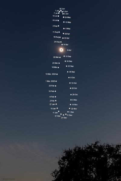Recorded from 2024 March 10, to 2025 March 1, this composited series of images reveals a pattern in the seasonal drift of the Sun's daily motion through planet Earth's sky. Known to some as an analemma, the figure-eight curve was captured in exposures taken on the indicated dates only at 18:38 UTC from the exact same location south of Stephenville, Texas. The Sun's position on the 2024 solstice dates of June 20 and December 21 would be at the top and bottom of the curve and correspond to the astronomical beginning of summer and winter in the north. Points that lie along the curve half-way between the solstices would mark the equinoxes. The 2024 equinox on September 22, and in 2025 the equinox on March 20 (today) are the start of northern fall and spring. And since one of the exposures was made on 2024 April 8 from the Stephenville location at 18:38:40 UTC, this analemma project also reveals the solar corona in planet Earth's sky during a total solar eclipse.