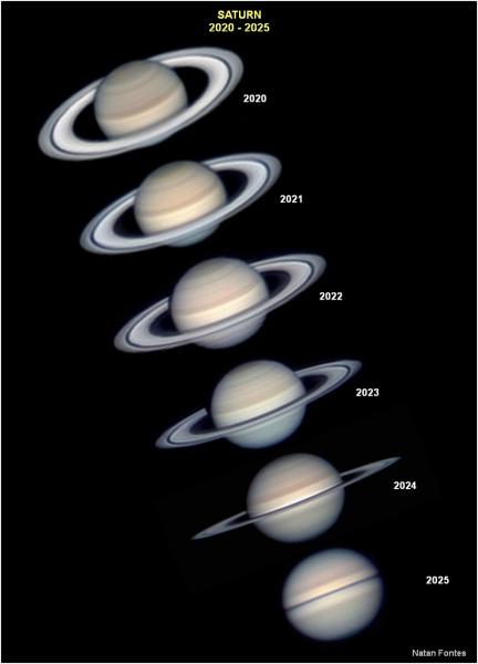 Where are Saturn's ears? Galileo is credited, in 1610, as the first person to see Saturn's rings. Testing out Lipperhey's recently co-invented telescope, Galileo did not know what they were and so called them "ears". The mystery deepened in 1612, when Saturn's ears mysteriously disappeared. Today we know exactly what happened: from the perspective of the Earth, Saturn's rings had become too thin to see. The same drama plays out every 15 years because Saturn, like Earth, undergoes tilt-driven seasons. This means that as Saturn goes around the Sun, its equator and rings can tilt noticeably toward the Sun and inner Solar System, making them easily visible, but from other orbital locations will appear almost not at all. The featured picture from Brasilia, Brazil shows a modern version of this sequence: the top ring-dominated image was taken in 2020, while the bottom ring-obscure image taken earlier in 2025. Make Saturn's Rings Musical: Play them like a harp!