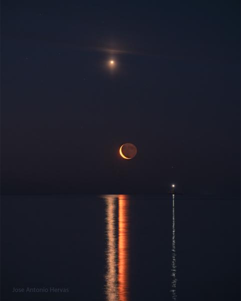 What’s causing those lines? Objects in the sky sometimes appear reflected as lines across water — but why? If the water’s surface is smooth, then reflected objects would appear similarly -- as spots. But if the water is choppy, then there are many places where light from the object can reflect off the water and still come to you -- and so together form, typically, a line. The same effect is frequently seen for the Sun just before sunset and just after sunrise. Pictured about 10 days ago in Ibiza, Spain, images of the setting Moon, Venus (top), and Saturn (right, faint) were captured both directly and in line-reflected forms from the Mediterranean Sea. The other bright object on the right with a water-reflected line is a beacon on a rock to warn passing boats. Explore Your Universe: Random APOD Generator