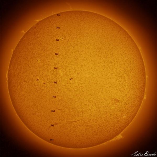 Typically, the International Space Station is visible only at night. Slowly drifting across the night sky as it orbits the Earth, the International Space Station (ISS) can be seen as a bright spot about once a month from many locations. The ISS is then visible only just after sunset or just before sunrise because it shines by reflected sunlight -- once the ISS enters the Earth's shadow, it will drop out of sight. The only occasion when the ISS is visible during the day is when it passes right in front of the Sun. Then, it passes so quickly that only cameras taking short exposures can visually freeze the ISS's silhouette onto the background Sun. The featured picture did exactly that -- it is actually a series of images taken a month ago from Sant Feliu de Buixalleu, Spain with perfect timing. This image series was later combined with a separate image highlighting the texture of the active Sun which included several Sun's prominences around the edge. Celestial Surprise: What picture did APOD feature on your birthday? (post 1995)
