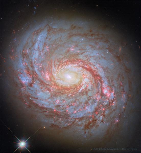 What's happening in the center of nearby spiral galaxy M77? The face-on galaxy lies a mere 47 million light-years away toward the constellation of the Sea Monster (Cetus). At that estimated distance, this gorgeous island universe is about 100 thousand light-years across. Also known as NGC 1068, its compact and very bright core is well studied by astronomers exploring the mysteries of supermassive black holes in active Seyfert galaxies. M77's active core glows bright at x-ray, ultraviolet, visible, infrared, and radio wavelengths. The featured sharp image of M77 was taken by the Hubble Space Telescope. The image shows details of the spiral's winding spiral arms as traced by obscuring red dust clouds and blue star clusters, all circling the galaxy's bright white luminous center. Free APOD Lecture in Phoenix: Wednesday, December 10 at 7 pm