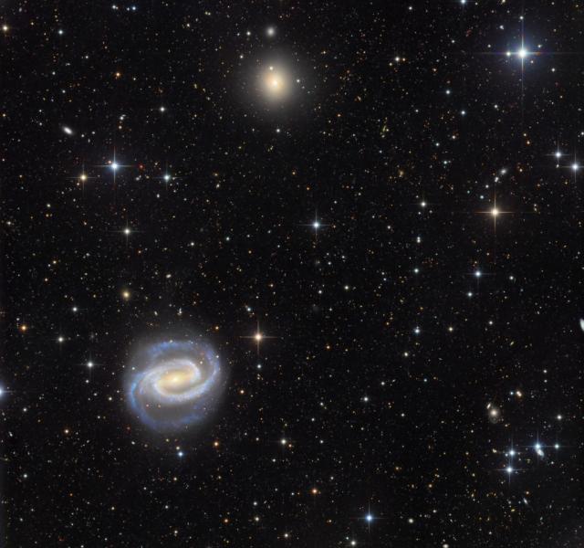 Spiral NGC 1300 and elliptical NGC 1297 are galaxies that lie on the banks of the southern constellation Eridanus (The River). At 70 million light-years distant or more, both are members of the Eridanus Galaxy Cluster. About 100,000 light-years across, at lower left in this sharp, galaxy group photo NGC 1300 is seen face-on with a prominent central bar and grand, sweeping spiral arms. Like other spiral galaxies, including our own barred spiral Milky Way Galaxy, NGC 1300 is thought to have a supermassive central black hole. A contrast in appearance and slightly more distant, NGC 1297 is the roughly spherical large elliptical galaxy near the top of the frame. With little active star formation, elliptical galaxies are composed of older populations of stars and are likely he result of multiple collisions and mergers with spirals.