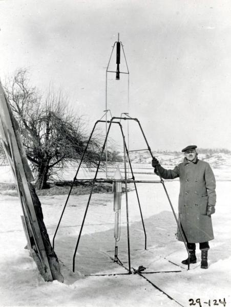 Robert H. Goddard, considered the father of modern rocketry, was born in Worcester Massachusetts in 1882. As a 16 year old, Goddard read H.G. Wells' science fiction classic "War Of The Worlds" and dreamed of space flight. By 1926 he had designed, built, and flown the world's first liquid fuel rocket. Launched 100 years ago, on March 16, 1926 from his aunt Effie's farm in Auburn Massachusetts, the rocket dubbed "Nell", rose to an altitude of 41 feet in a flight that lasted about 2 1/2 seconds. In this posed photo Goddard stands next to the 10 foot tall rocket, holding the launch stand frame. To achieve a stable flight without the need for fins, the rocket's heavy motor was located at the top, fed by lines from liquid oxygen and gasoline fuel tanks at the bottom. Widely recognized as a gifted experimenter and engineering genius, his rockets were many years ahead of their time. Goddard was awarded over 200 patents in rocket technology, most of them after his death in 1945. A liquid fuel rocket constructed on principles developed by Goddard landed humans on the Moon in 1969.