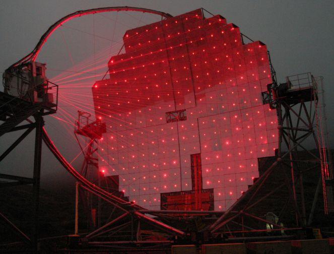 Explanation: Is it magic? On a rare foggy night, mysterious laser beams seem to play across the MAGIC telescope at Roque de los Muchachos on the Canary Island of La Palma. The lasers are actually part of a system designed to automatically adjust the focusing of the innovative, seventeen meter wide, multi-mirrored instrument. The MAGIC (Major Atmospheric Gamma Imaging Cherenkov) telescope itself is intended to detect gamma rays - photons with over 100 billion times the energy of visible light. As the gamma rays impact the upper atmosphere they produce air showers of high-energy particles. The MAGIC camera records in detail the brief flashes of optical light, called Cherenkov light, created by the air shower particles that ultimately correspond to cosmic sources of extreme gamma-rays. While the MAGIC I telescope became operational this year, the dramatic picture shows the nearly completed version of the instrument in October 2003.