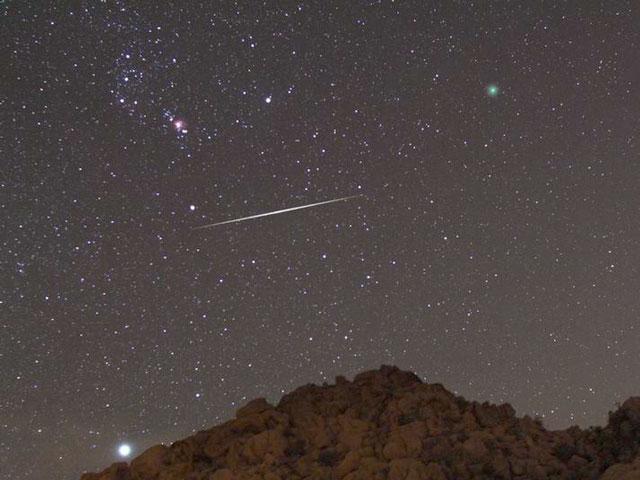 Explanation: Several wonders of the late-year northern sky appeared together for a few fleeting moments on December 13. On the bottom left, just above the hill, is blue Sirius, the brightest star in the sky. Above Sirius and slightly to the right of the belt of Orion is the red Orion Nebula, one of the most famous nebulas on the sky. Below and to the right of the Orion Nebula streaks a yellow meteor, although moving in the wrong direction to be from the Geminids meteor shower that peaked the night. Finally, above and to the right of the meteor is Comet Machholz, whose coma appears here relatively green. Since the time since this image was taken over a Californian hill, the Geminid meteor has long since evaporated. Comet Machholz has brightened and moved to the north. Sirius, however, will remain in the constellation of Canis Major indefinitely. News: APOD editor to speak in January in New York