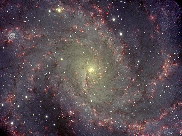 NGC 6946 is home to a nuclear starburst itself, and picturesque dark dust is seen lacing the disk along with